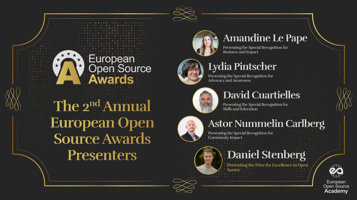 | 19:40-19:55 | Awarding of the Prize for Excellence in Open Source | Presentation of the Prize for Excellence in Open Source, presented by Daniel Stenberg (EOSA President) |